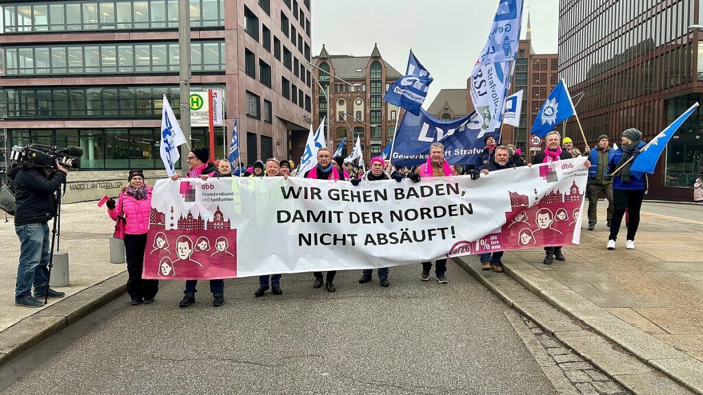 „Wir gehen baden, damit der Norden nicht absäuft“ – so lautete das Motto der Protestaktion des dbb in Hamburg. Einige Protestierende sprangen in die Elbe,
