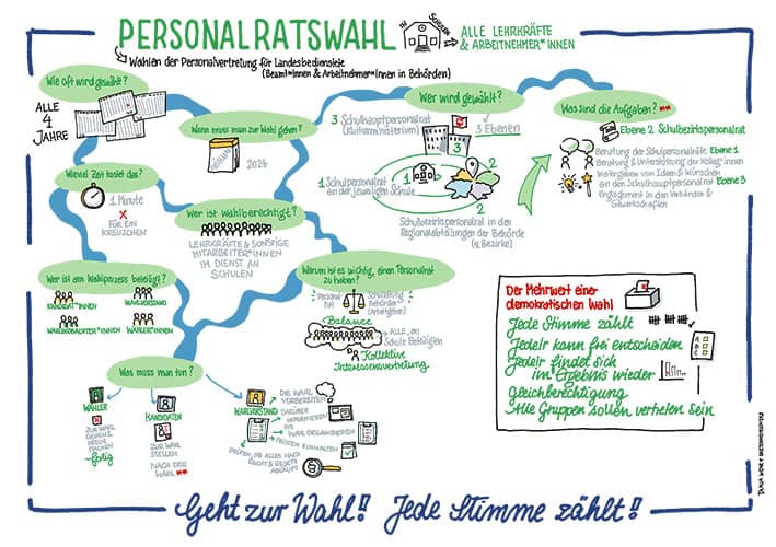 Der Schulpersonalrat vertritt eure Interessen vor Ort. Sie arbeiten nach dem Gebot der vertrauensvollen Zusammenarbeit mit der Schulleitung zusammen. Die Schulbezirkspersonalräte arbeiten auf Ebene der vier Regionalen Landesämter für Schule und Bildung (RLSB). Sie werden angefordert, wenn es z.B. zwischen Schulpersonalrat und Schulleitung zu keiner Einigung kommt. Außerdem sind sie Ansprechpartner für eure Fragen rund um das Personalrecht und die Umsetzung in der Schule.