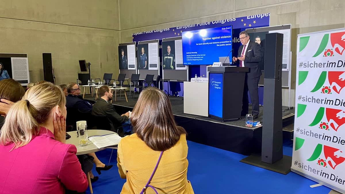 „Die Gewalt gegen Beschäftigte im öffentlichen Dienst ist ein absolutes No Go. Das darf nicht sein“, machte Andreas Hemsing, stellvertretender dbb Bundesvorsitzender und Vorsitzender der komba gewerkschaft am 17. April 2024 auf dem Europäischen Polizeikongress in Berlin deutlich. „Die körperliche und seelische Unversehrtheit unserer Kolleginnen und Kollegen sicherzustellen, ist gerade in turbulenten Zeiten wie diesen eine gesamtgesellschaftliche Aufgabe.“ Das Vertrauen der Bevölkerung in die Handlungsfähigkeit des Staates liege bei niedrigen 27 Prozent, die gesellschaftliche Verunsicherung, Stimmungsmache gegen den Rechtsstaat und die Rauheit im Diskurs nehmen zu. „Unsere Kolleginnen und Kollegen halten die freiheitlich-demokratische Grundordnung, auf der unser gesellschaftliches Leben fußt, aufrecht. Daher ist jede und jeder einzelne – sind wir alle gemeinsam dafür verantwortlich, dass diese Grundordnung weiter besteht.“ Hemsing erwartet auch mehr Rückhalt von der Politik: „Wir brauchen dringend eine systematische Erfassung der Angriffe auf die Beschäftigten im öffentlichen Dienst sowie gut entwickelte Methoden der Prävention, Reaktion und Nachsorge.“ Der Staat dürfe seine Beschäftigten nicht im Stich lassen.