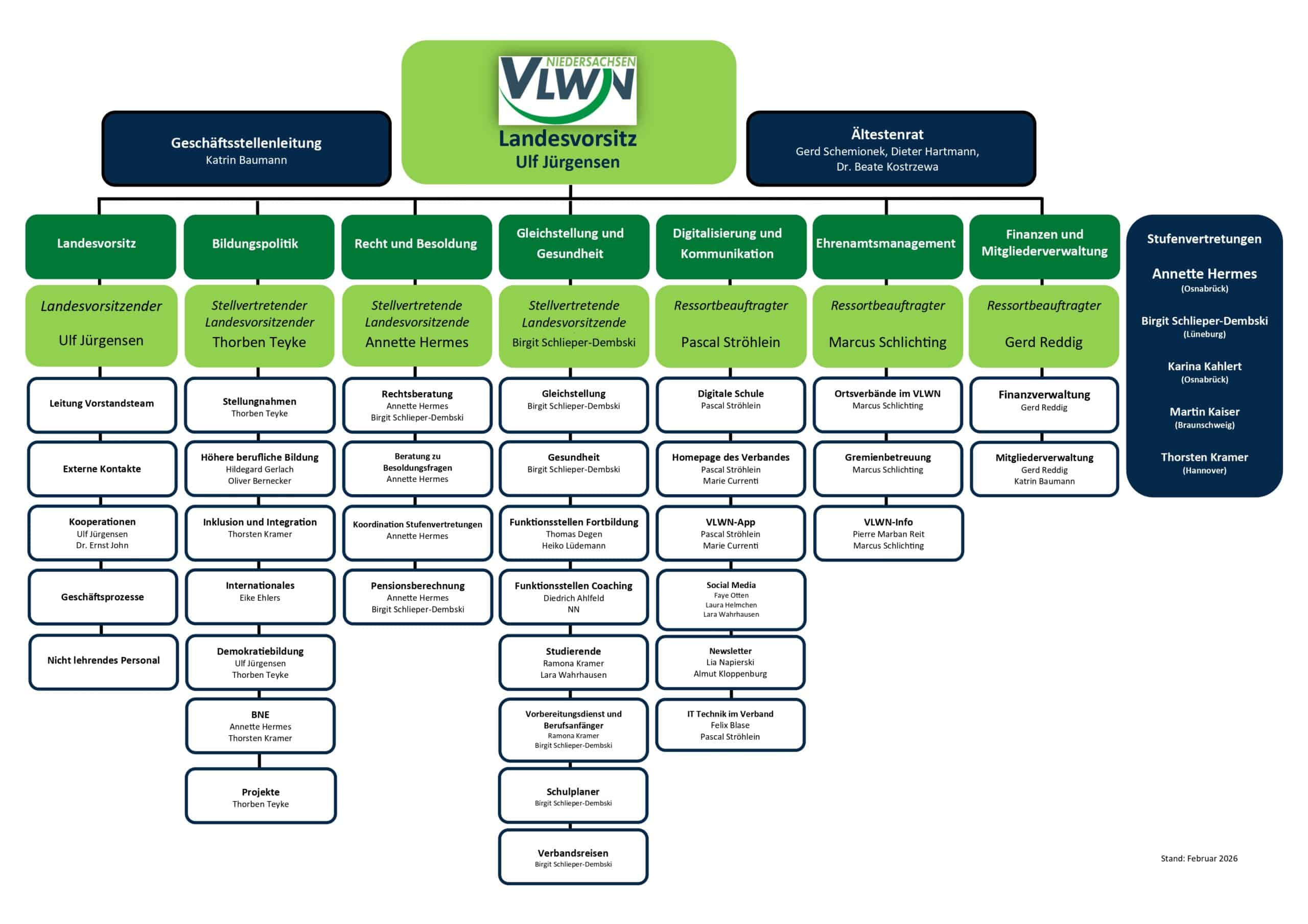 Organigramm Landesvorstand | VLWN Verband für Lehrerinnen und Lehrer an Wirtschaftsschulen in Niedersachsen | 02/2026 | Raffaelstr. 4 | 30177 Hannover